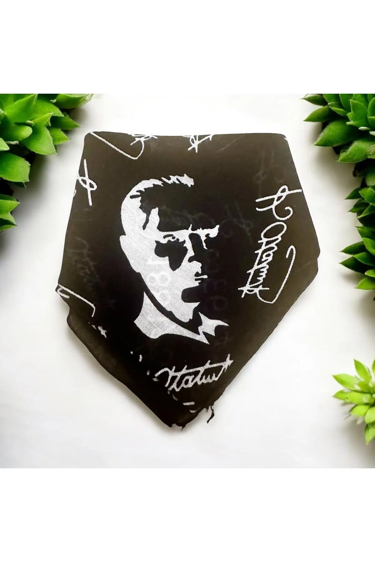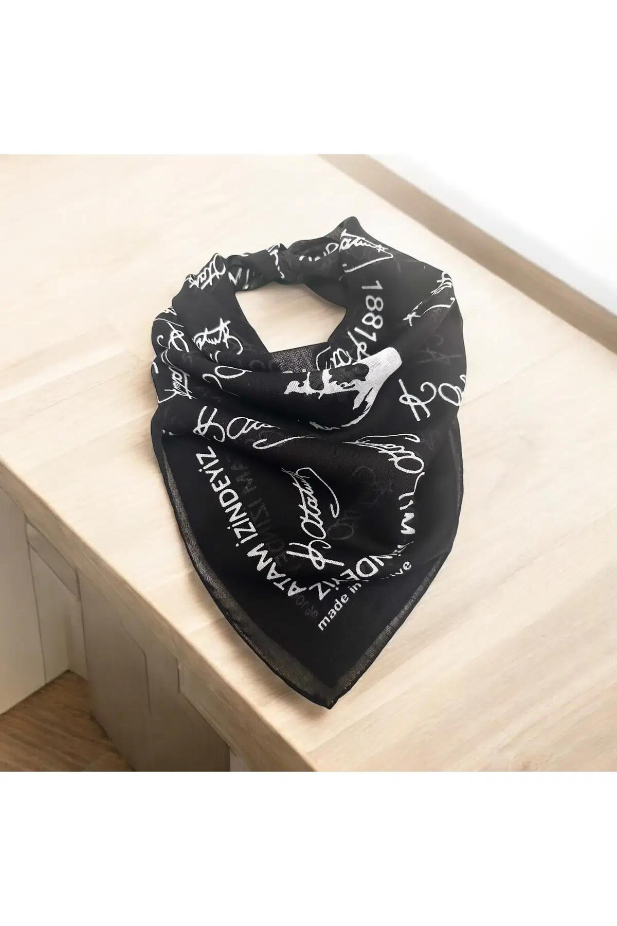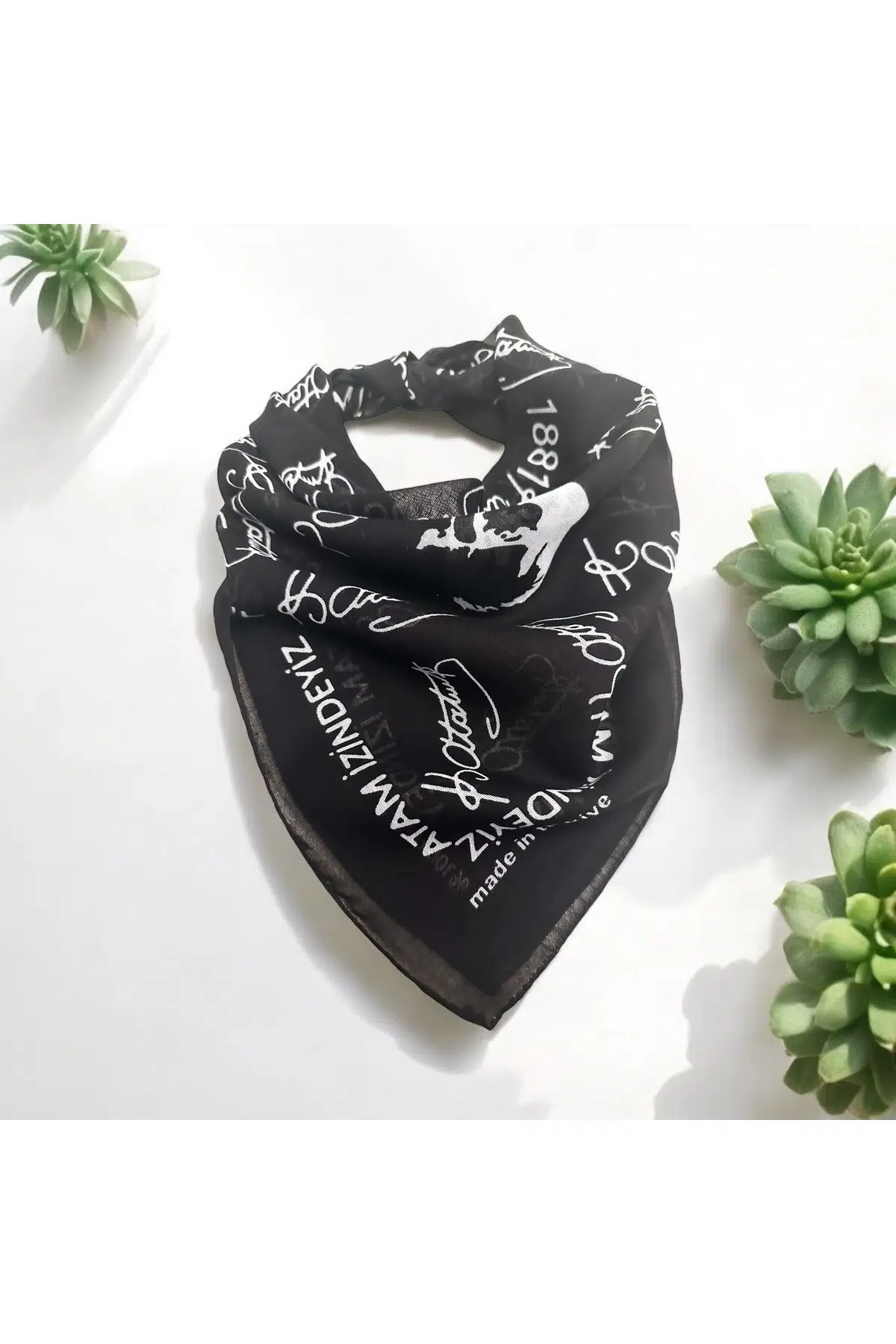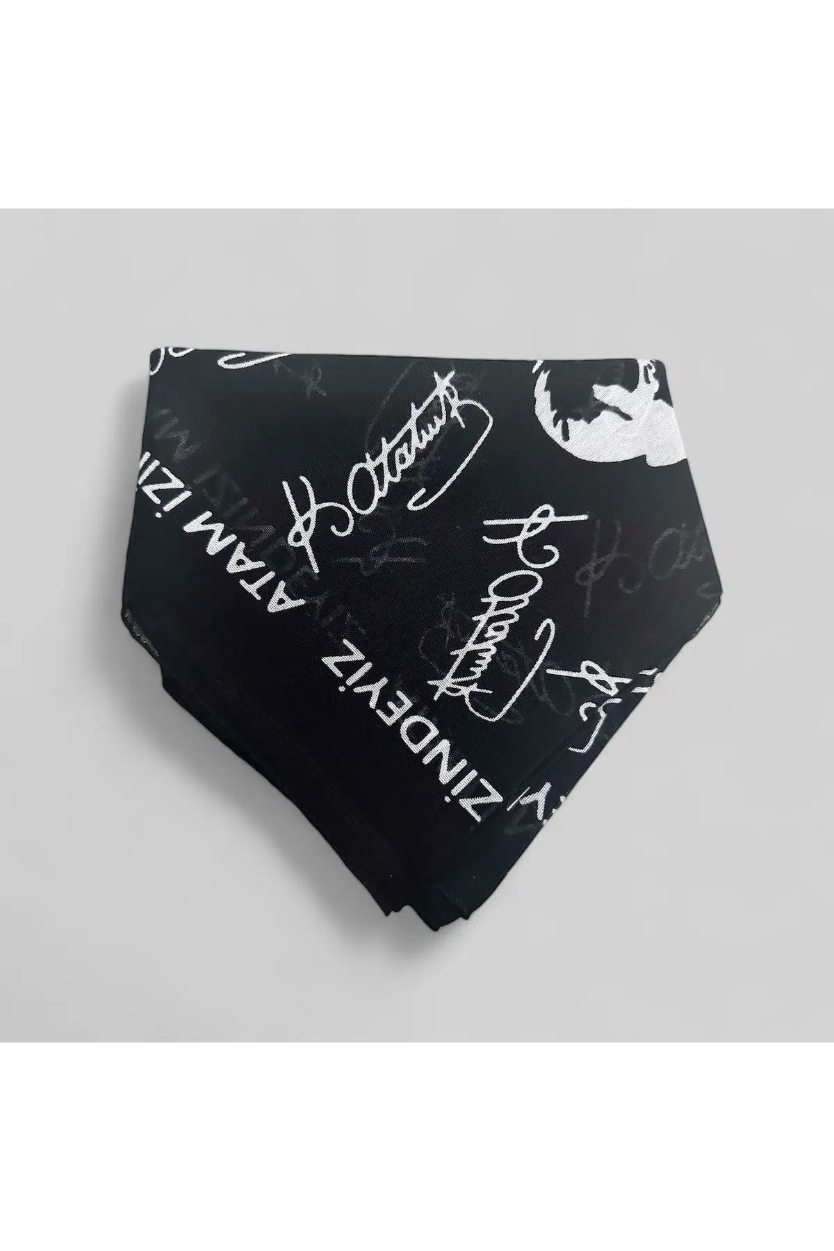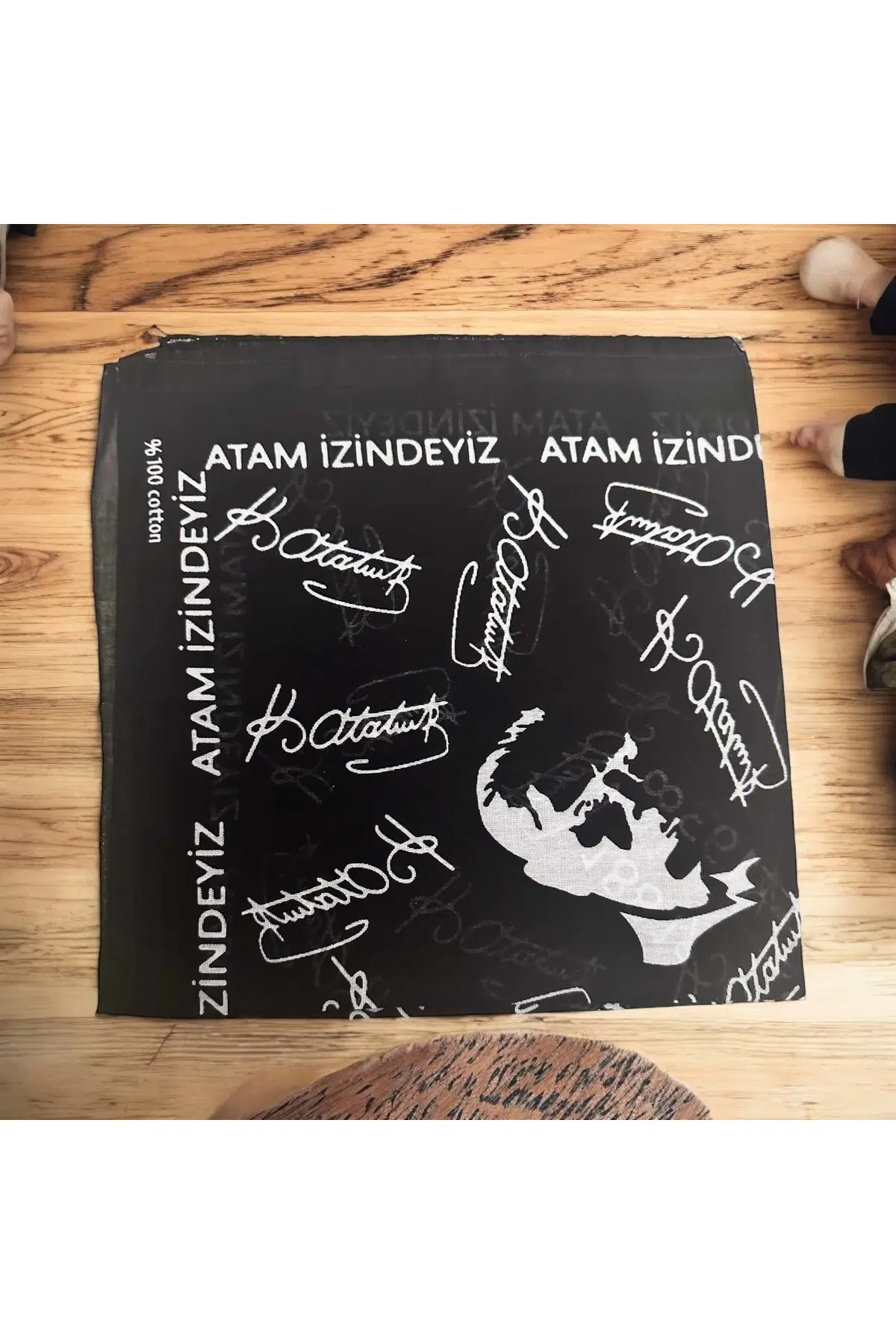 MODAVALS 10 KASIM UNISEX ATAM İZİNDEYİZ YAZILI ve ATATÜRK PORTRE & İMZALI PAMUK KUMAŞ FULAR BANDANA-SİYAH BEYAZ
