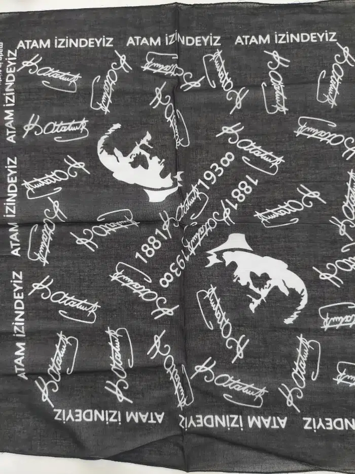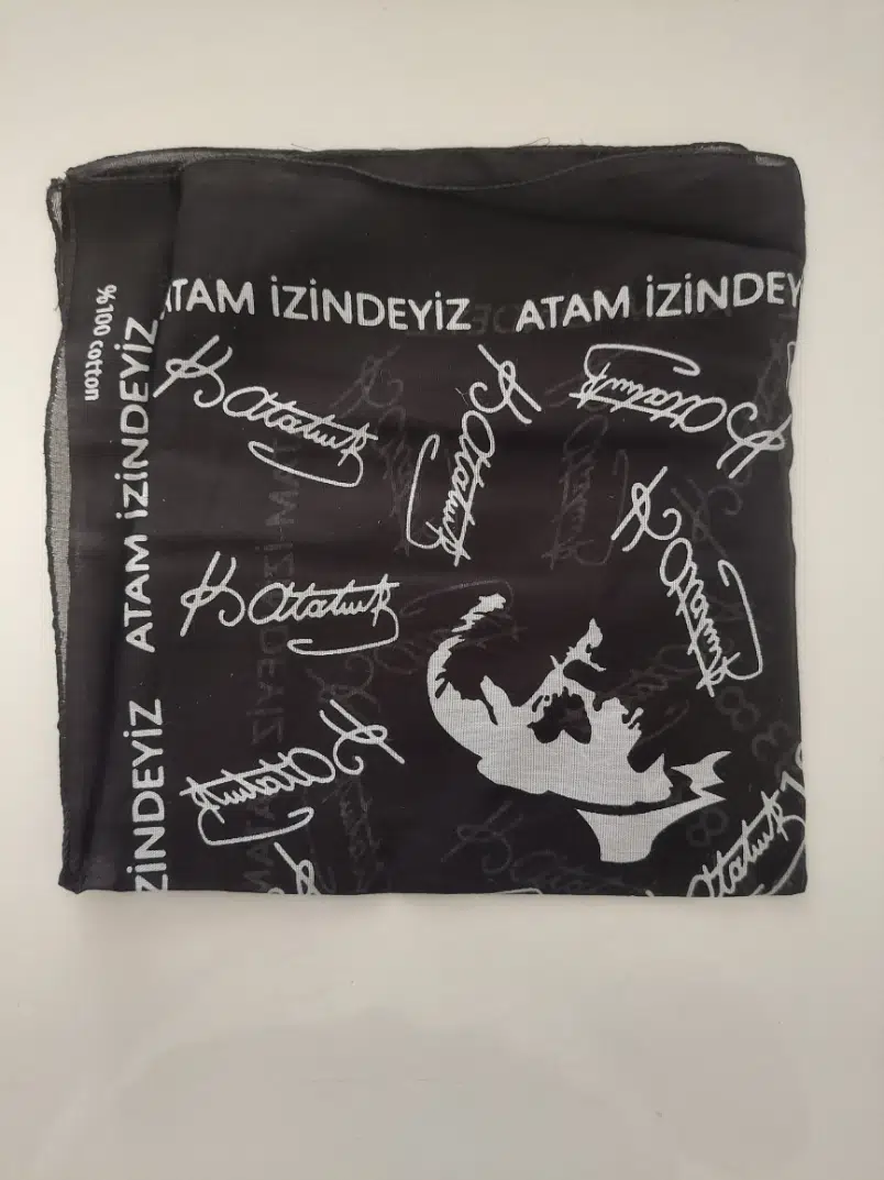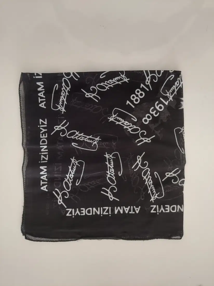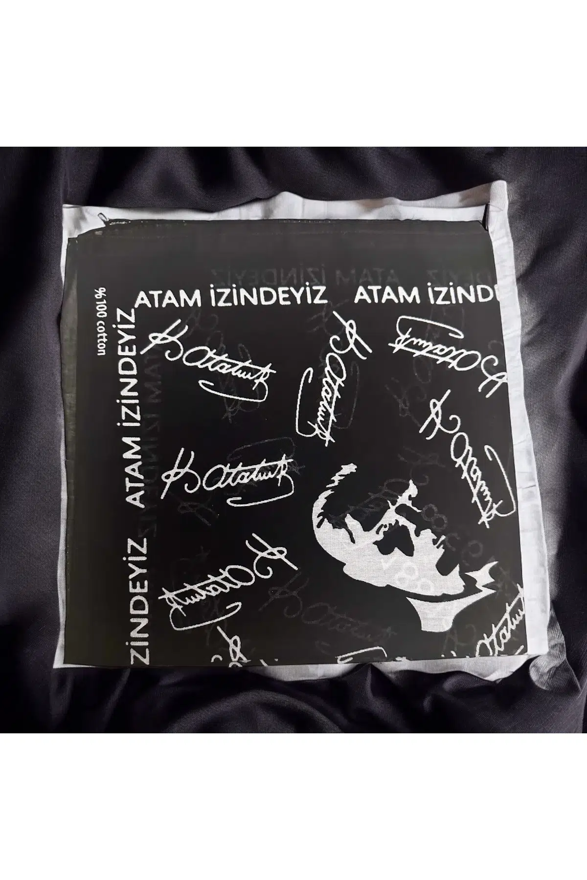 Unisex tasarımı ile herkes tarafından rahatlıkla kullanılabilen siyah renkli bandana. Atatürk'ün imzası ve "Atam İzindeyiz" yazısı ile özel bir anlam taşıyan tasarım. Pamuklu kumaş yapısı sayesinde cildinize nazik dokunuşlar sunar ve gün boyu konfor sağlar. Düz deseniyle sade ve şık bir görünüm elde etmenizi sağlar, her türlü kıyafetle kolayca kombinlenebilir. %100 Pamuktur. Terletmez. Kullanıma Uygundur. Boynunuzda, Saçınızda, Bileğinizde Aksesuar Olarak Çok Amaçlı Kullanılabilir. (Fular, Bandana, Bileklik, Boyun Bandı, Çanta Aksesuarı, Saç Bandı, Kafa Bandı, Toka, Taç, Mendil gibi.) Hem erkek hem kadın hem genç hem de çocuklar kullanabilir. Her yaşa uygundur.-
