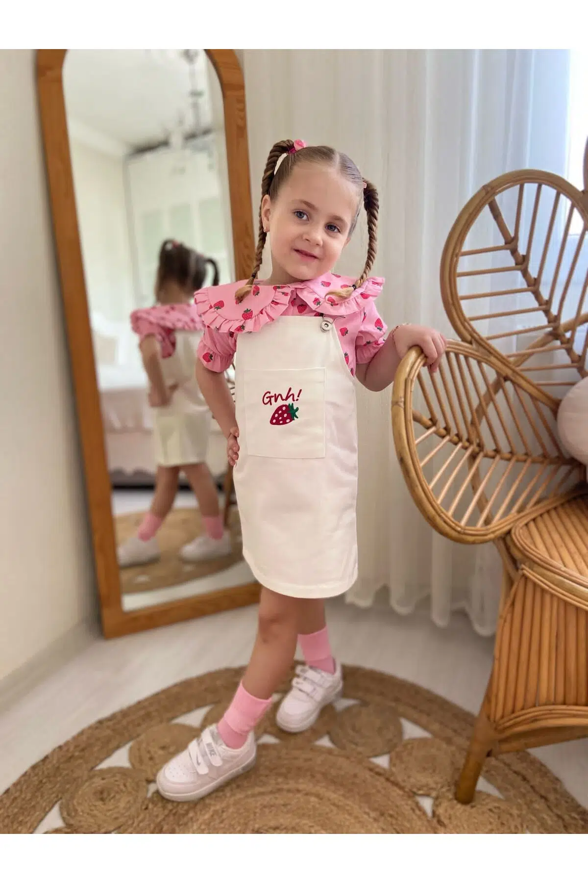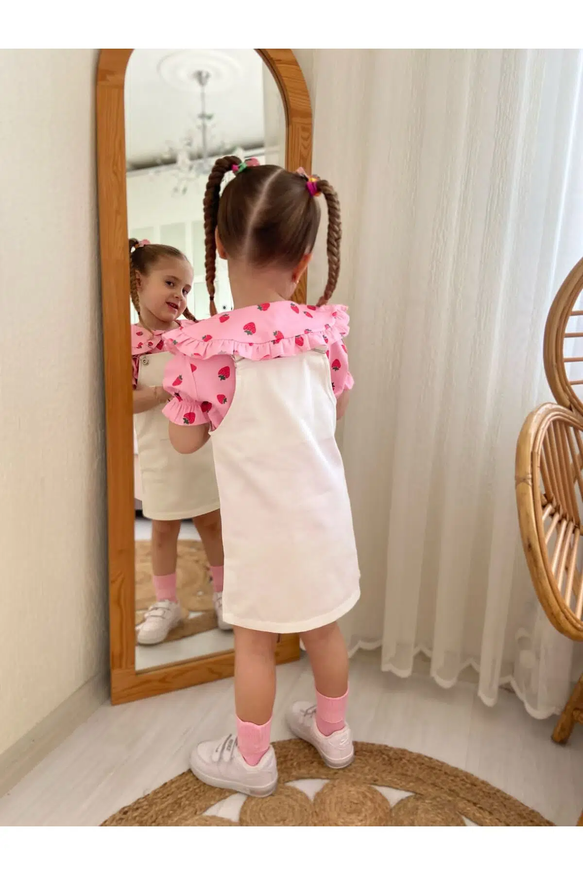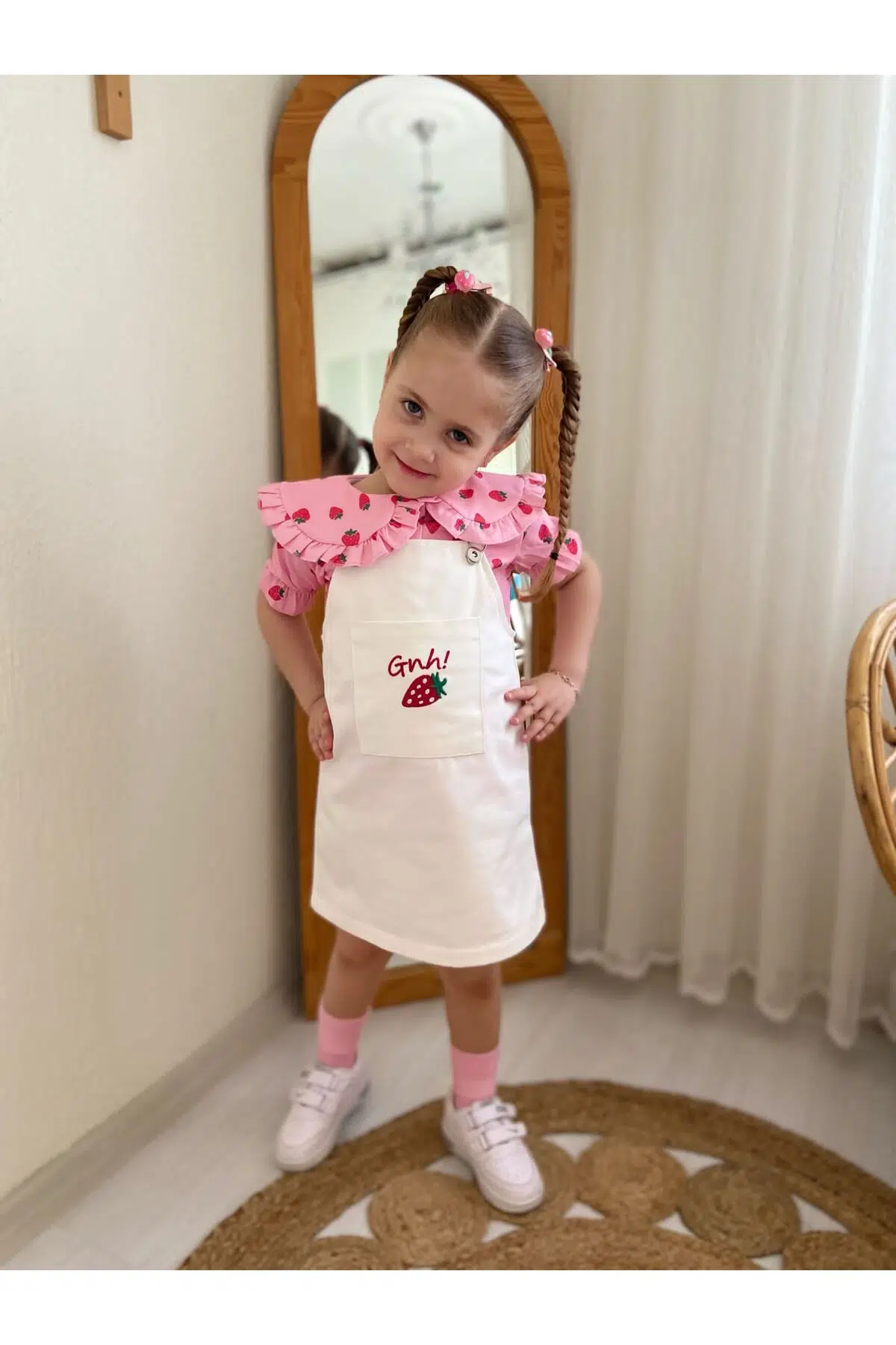 Gabardin Jile; metal ayarlanabilir askılı, önde çilek baskılı cep detaylı, beyaz renk
