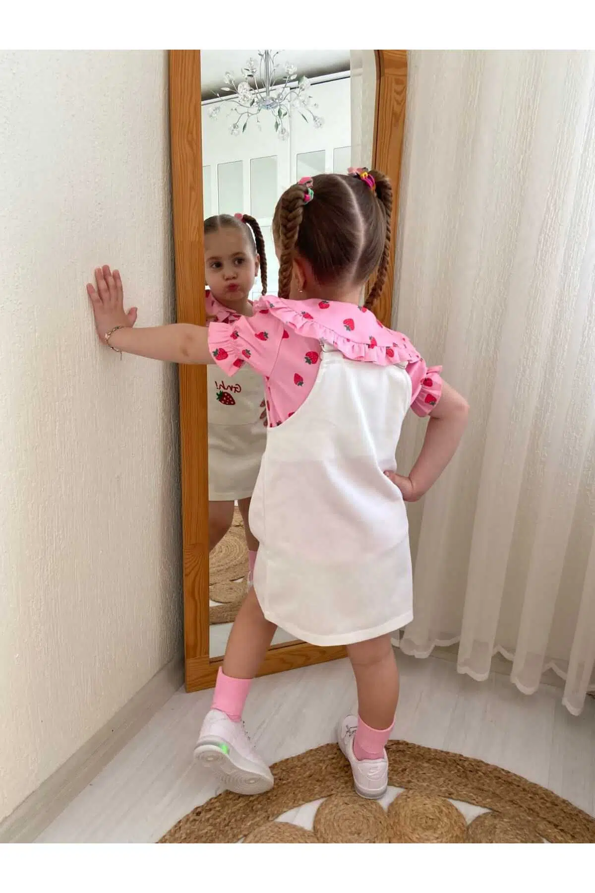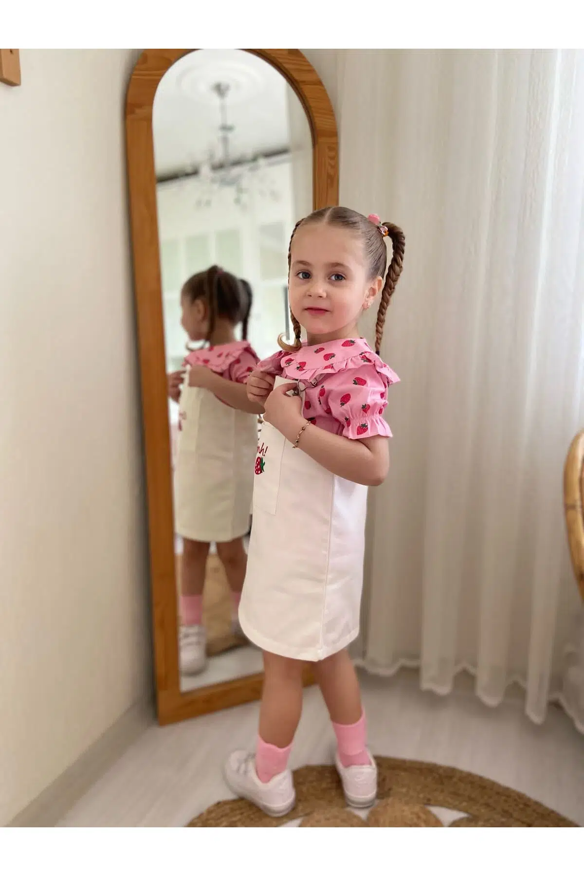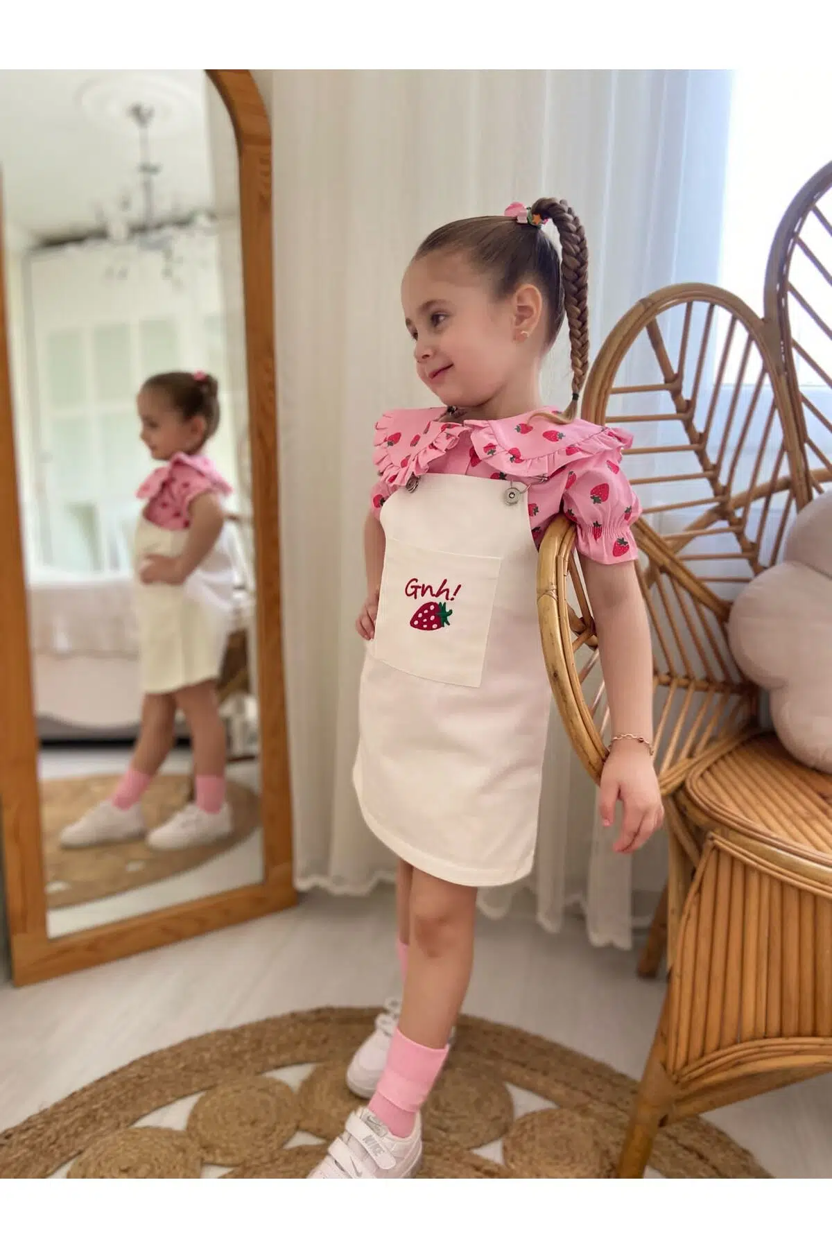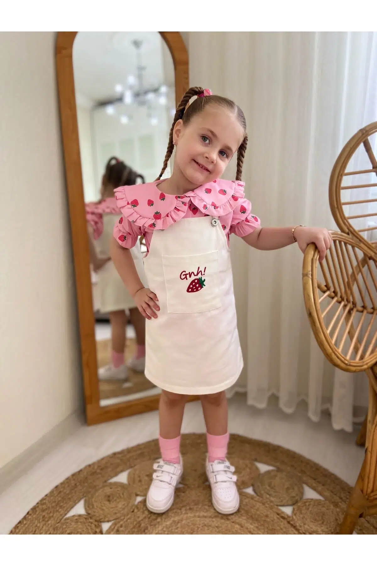 Gabardin Jile; metal ayarlanabilir askılı, önde çilek baskılı cep detaylı, beyaz renk